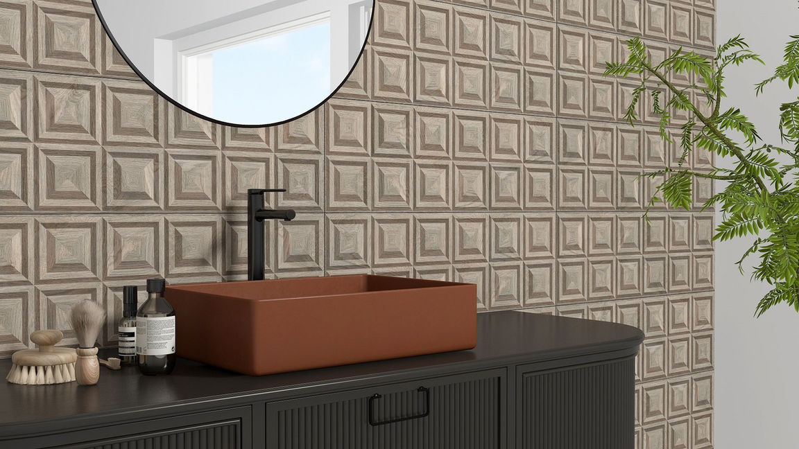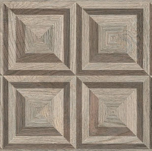 Elevate your interiors with the illusion of sculpted timber. Crafted from glazed porcelain, these rectified tiles boast a 3D concentric square pattern, blending rustic charm with modern elegance.